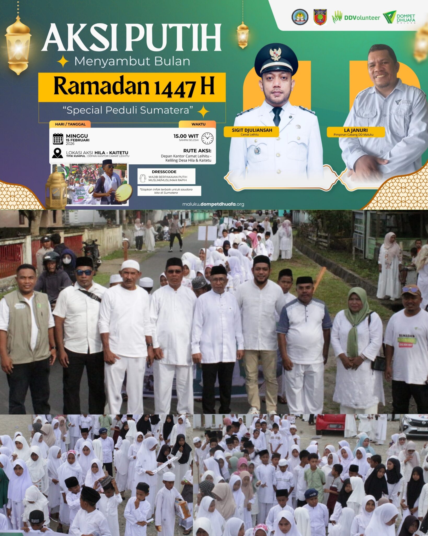 LENTERA.PRESS, Leihitu – Dompet Dhuafa Maluku bersama Camat Leihitu menggelar Pawai Putih dalam rangka menyambut bulan Ramadan 1447 Hijriah, Minggu (15/2/2026). Kegiatan yang berlangsung meriah ini dipusatkan di wilayah Kecamatan Leihitu dan diikuti ratusan peserta dari berbagai elemen pendidikan dan masya rakat. Pawai diawali dengan pembukaan resmi yang dipimpin oleh (Amin Fidmatan) mewakili Pimpinan Cabang…